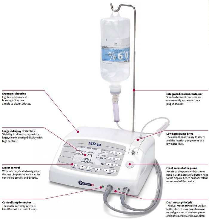 This unique motor system, consisting of the housing, electronic motor, footswitch and irrigation pump, offers two motor connections, making work considerably simpler and more efficient.