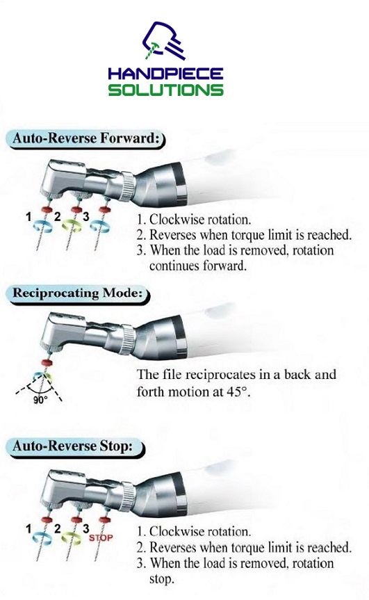 -Auto-Forward/Reverse: When the pre-set torque level is reached, the handpiece will reverse to run counter-clockwise until the file is free from the load, then continue to rotate clockwise.