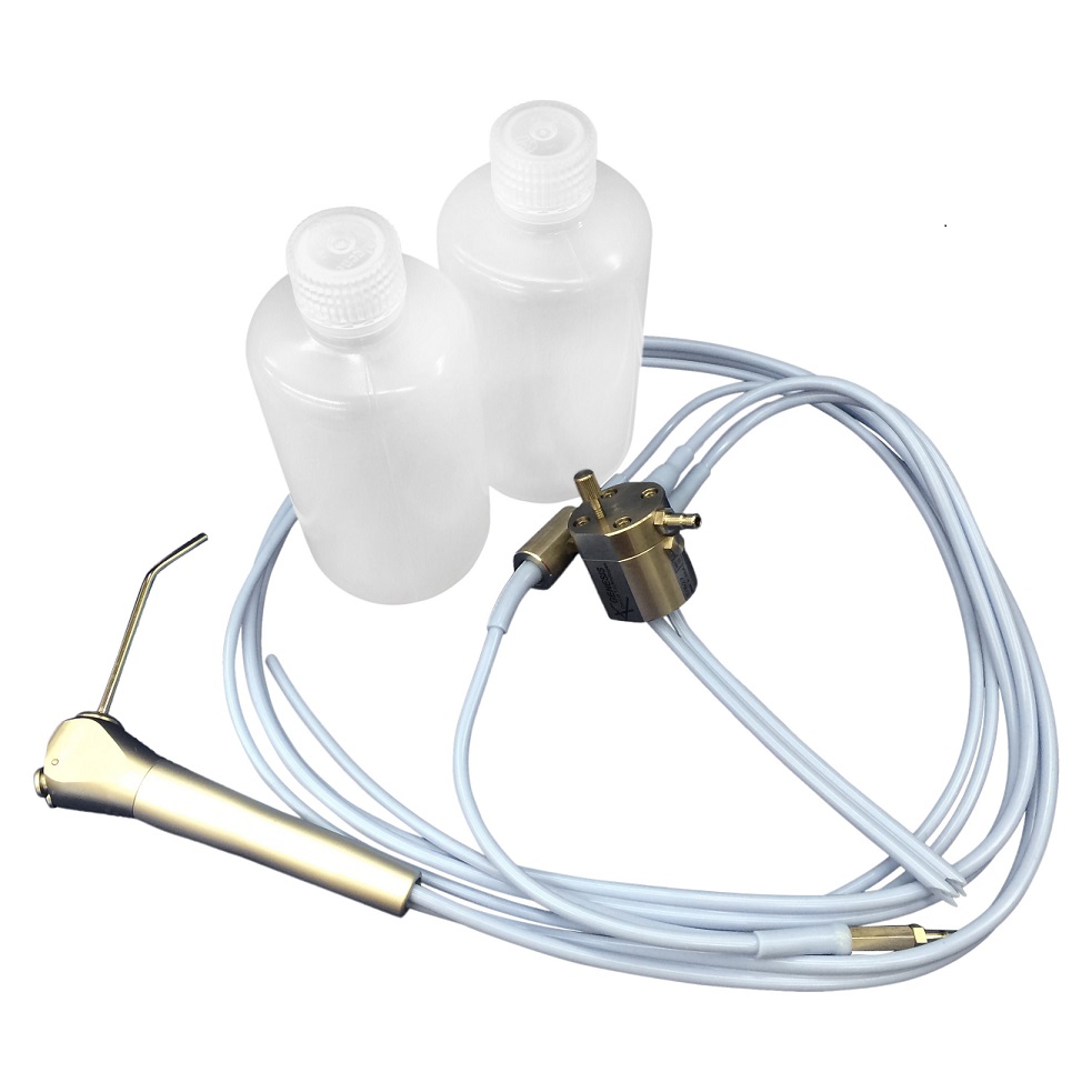 Fully autoclavable system with (2) 8 ounce autoclavable bottles. Uses autoclavable tubing for sterile delivery pathway, eliminating possible waterline contamination.