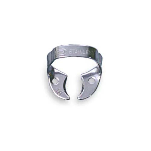 Rubber dam clamp with a round beak for use on upper and lower molars.
