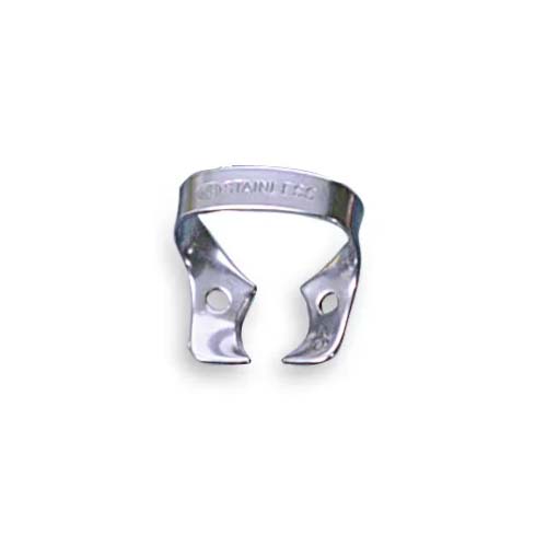 Rubber dam clamp for use on upper molars, especially erupted teeth.