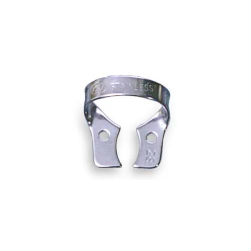 Rubber dam clamp with wide fringe for use on upper and lower molars.