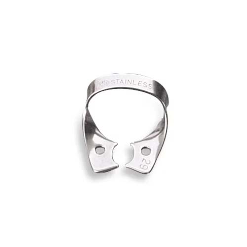 Rubber dam clamp with broad beak for use on upper and lower bicuspids.
