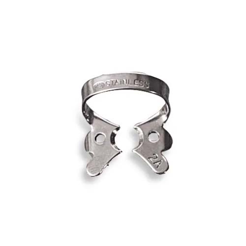 Rubber dam clamp with large, flat beaks for use on lower bicuspids.
