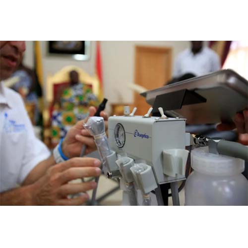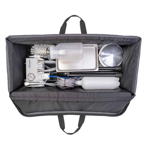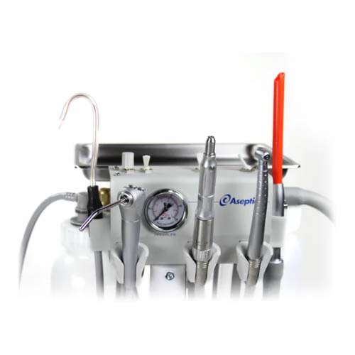 The ADU-04ST Portable Dental Delivery System features two handpiece connections--one highspeed and one low. Quickly connect to an air source with the included 25 foot air line. This dental delivery unit includes rheostat foot control, stainless steel instrument tray, 1 liter water reservoir, and carrying case.