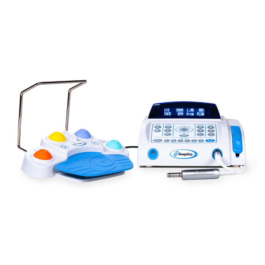 A multifunction foot control provides hands-free management of pump operation, flow rate, micromotor direction, preset selection, and torque.