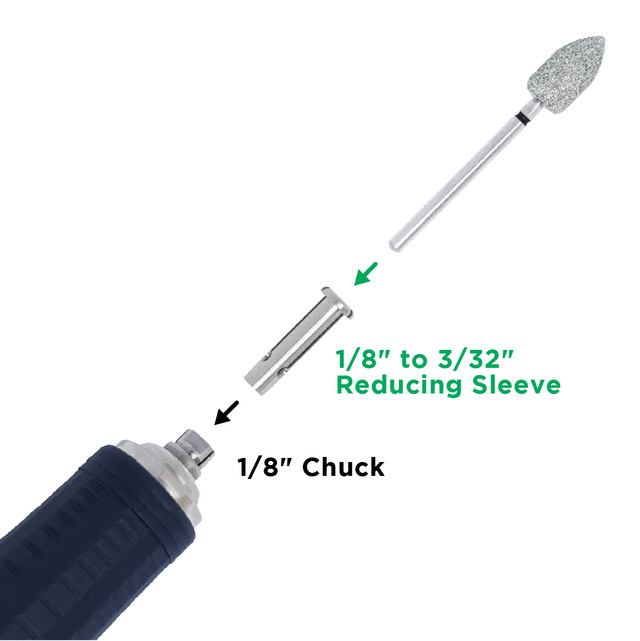 This adapter is used to reduce the 1/8” size chuck down to accept a 3/32” bur